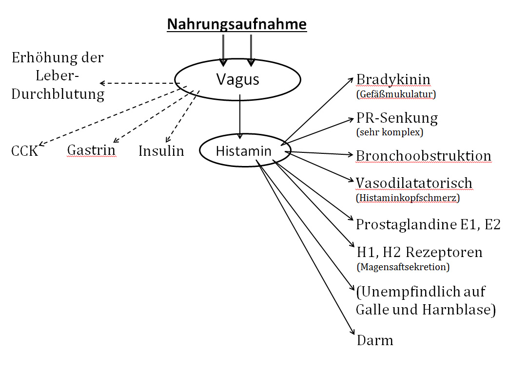Das körpereigene Histamin, das während des Essen produziert wird, ist für mich das eigentliche Problem und nicht die Menge des Histamins in den Nahrungsmitteln. Wird weniger körpereigenes Histamin produziert, kann automatisch mehr Histamin aus Nahrungsmitteln vertragen werden. Histamin ist ein Hormon, dessen Produktion vom Nervus vagus während des Essens angeregt wird, und der die typischen Allergiesymptome wie tränende Augen, Schnupfen, Hautreaktionen, enge Bronchien und weitere Beschwerden auslösen kann. Wir beobachten, dass bei Normalisierung der oben genannten Nahrungsmittelimpulse die Histaminunverträglichkeit zurückgeht.